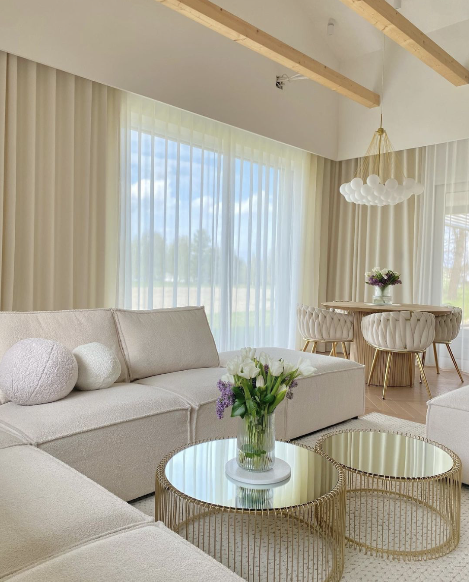 Tirai juga memainkan peran penting dalam membangun nuansa ruang. Bahan ringan dengan jatuh yang lembut dapat menghadirkan kesan lapang dan terang, sementara kain yang lebih tebal memberi suasana intim dan nyaman saat sore menjelang malam. Perpaduan tekstil dengan pencahayaan hangat akan memperkuat kesan rileks dan ramah.